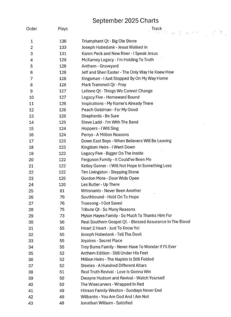 Gospel 91 September 2025 ChartMedia Email: media@gospel91.com Light (0-25) Light/Medium (26-50) Medium (51-75) Medium/ Heavy (76-100) Heavy (101-150)